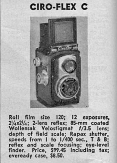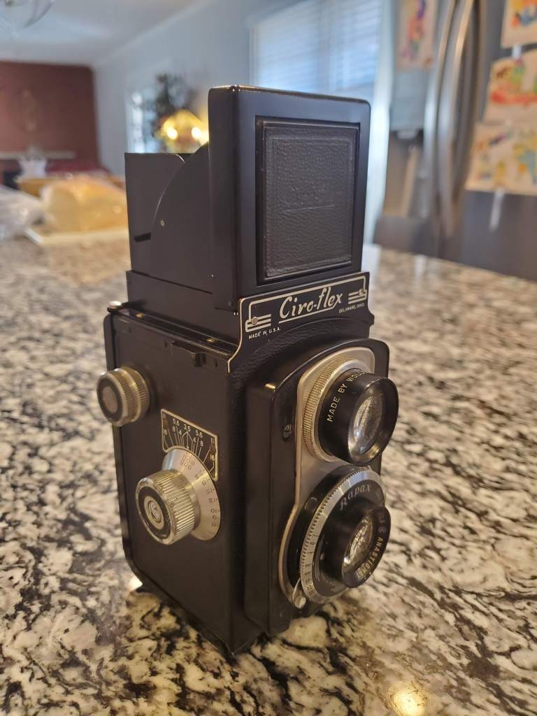 I found this camera on FB Marketplace. It turns out an antique store not far from my home was advertising it. I talked them down in price and paid a grand total of $25.71 (after tax). My research on this Ciro-flex TLR taught me that it was manufactured in the U.S.A. (Detroit, MI and then Delaware, OH to be specific), beginning in the ’40s. There were several models from this line, but the camera bodies made no designation of which model was which. The way to differenitiate between them is by comparing features and equipment.