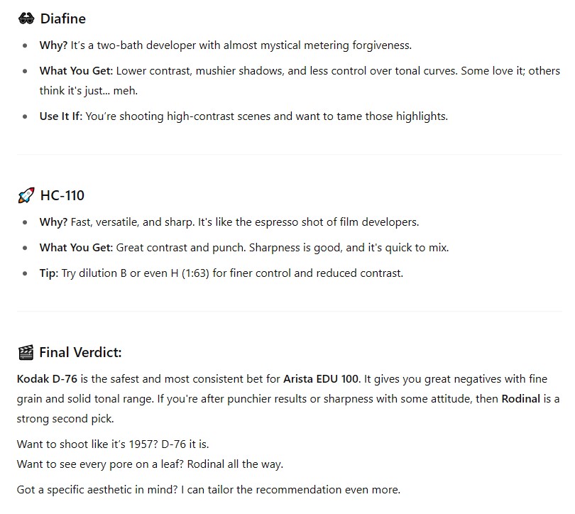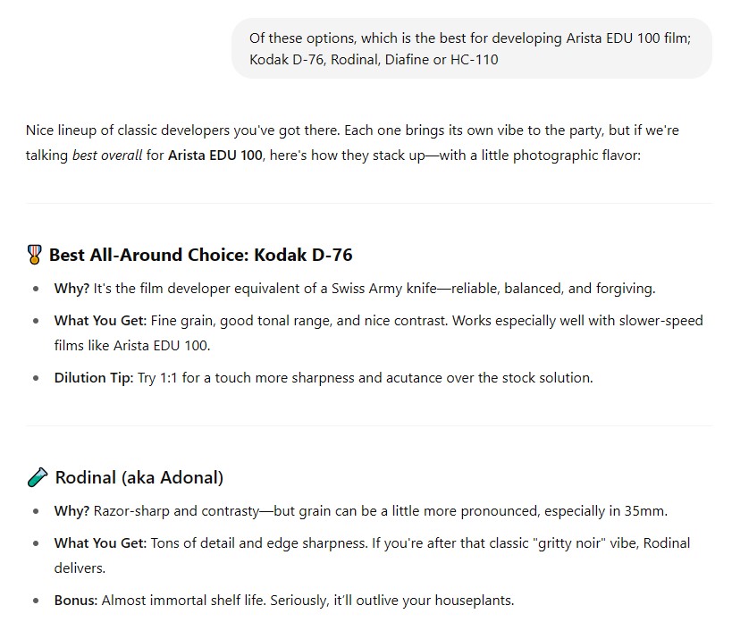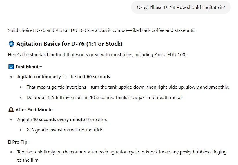 Then, I decided to let the AI chat-bot tell me how to agitate the film during processing.