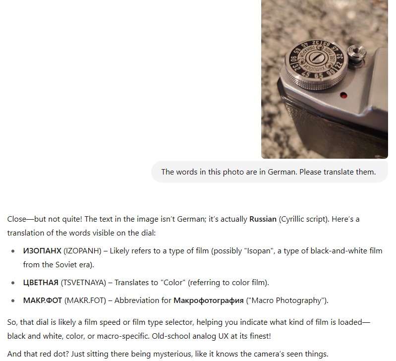 With no context at all, ChatGPT caught the fact that this text was Russian not German. AND, it told me the dial was likely a film speed or film type selector. Incredible! And I also liked the fact that ChatGPT was witty and a little cheeky.