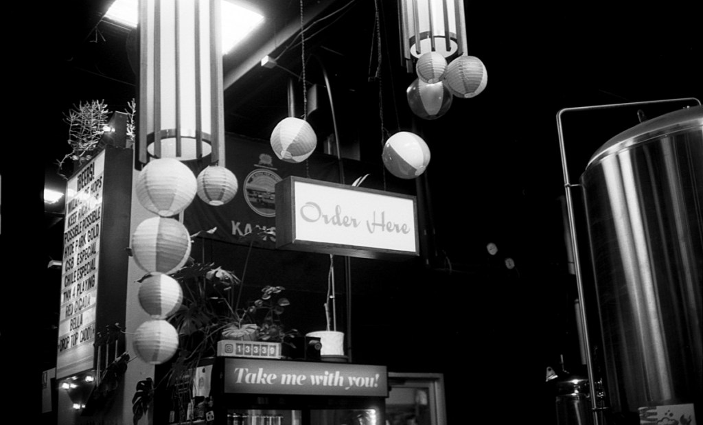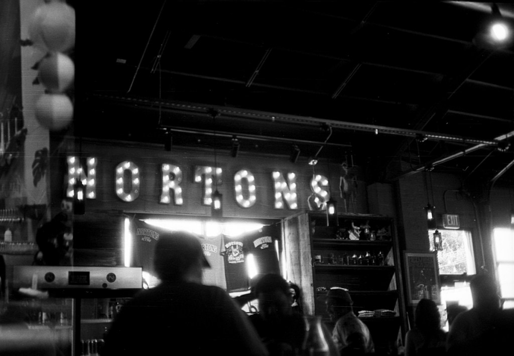 My girlfriend and I hit up a few breweries on Saturday. I had my trusty Canon Canonet QL 17 with me. It is equipped with a fixed, but fast, 45mm f/1.7 lens. I only had a ten frame roll of black and white in the camera. It was a bulk-loaded roll of Arista EDU Ultra 100. I developed in Diafine. Even though I was using slow film, the big 1.7 aperature allowed me to snag a few indoor shots. ICT locals will immediatley recognize where these were taken.